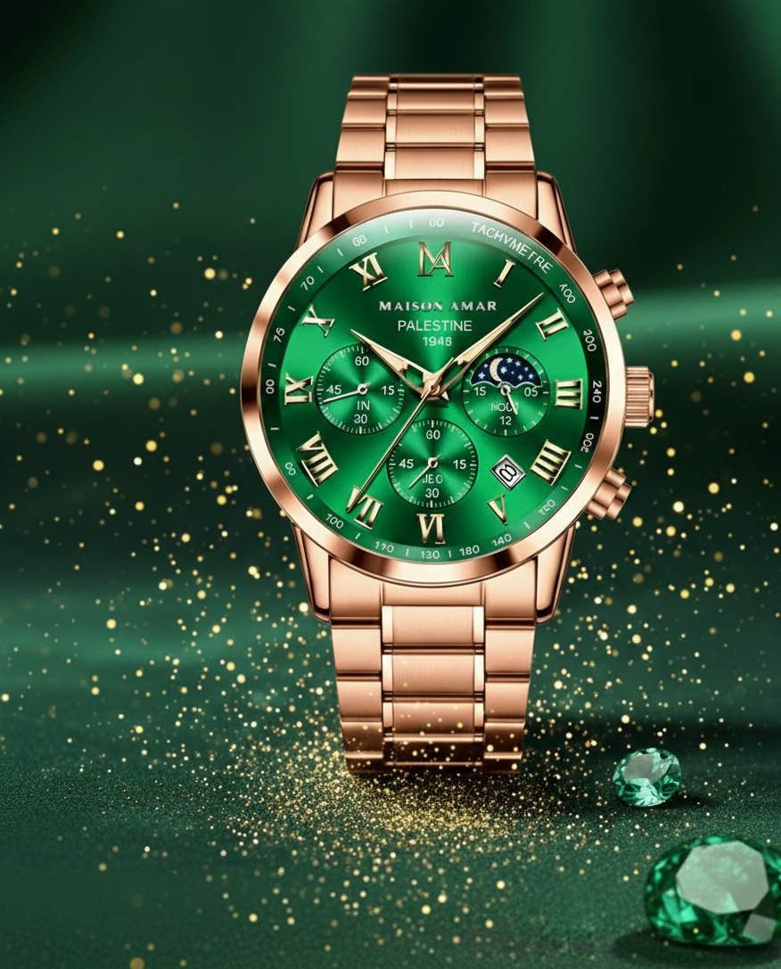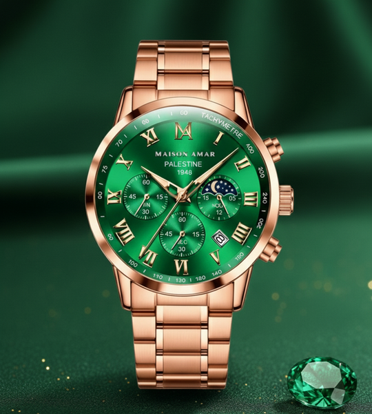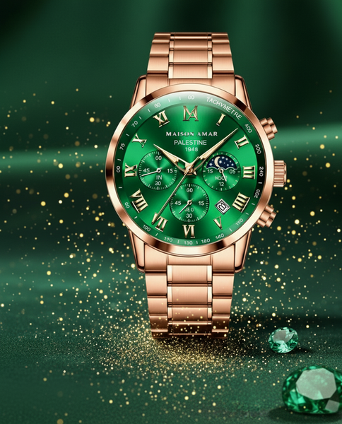 The Maison Amar Regal is a breathtaking embodiment of luxury, heritage, and commanding presence. This timepiece transcends mere function, offering a wearable piece of art that fuses the profound legacy of Palestine 1948 with an aesthetic of unparalleled grandeur. It is crafted for those who appreciate the finest details and desire a watch that speaks volumes of their refined taste.
