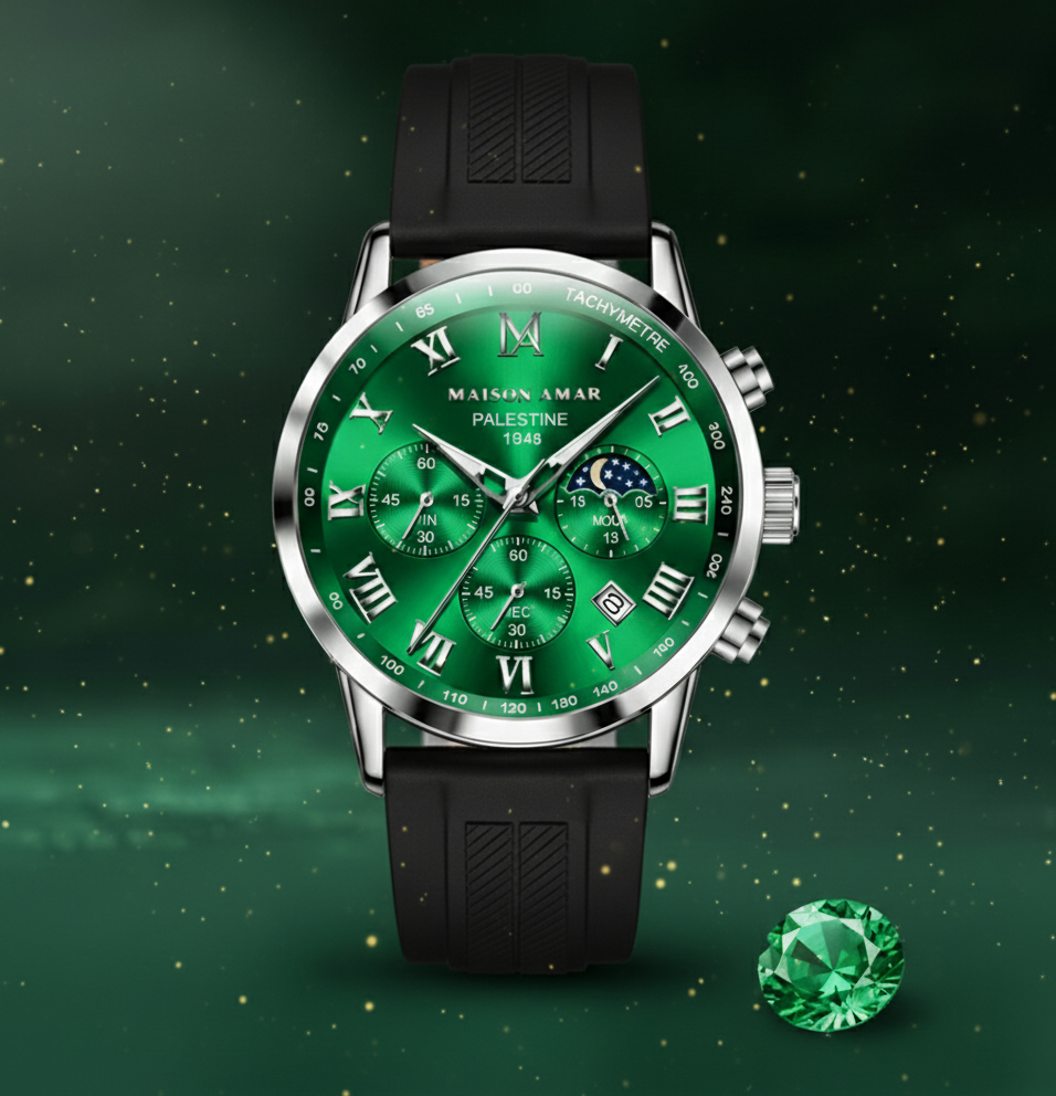 The Maison Amar Sentinel is the ultimate expression of strength and resilience, designed for the modern individual who faces every challenge with steadfast resolve. This timepiece combines the classic heritage of Palestine 1948 with a robust, high-performance aesthetic, making a powerful statement of enduring vigilance.