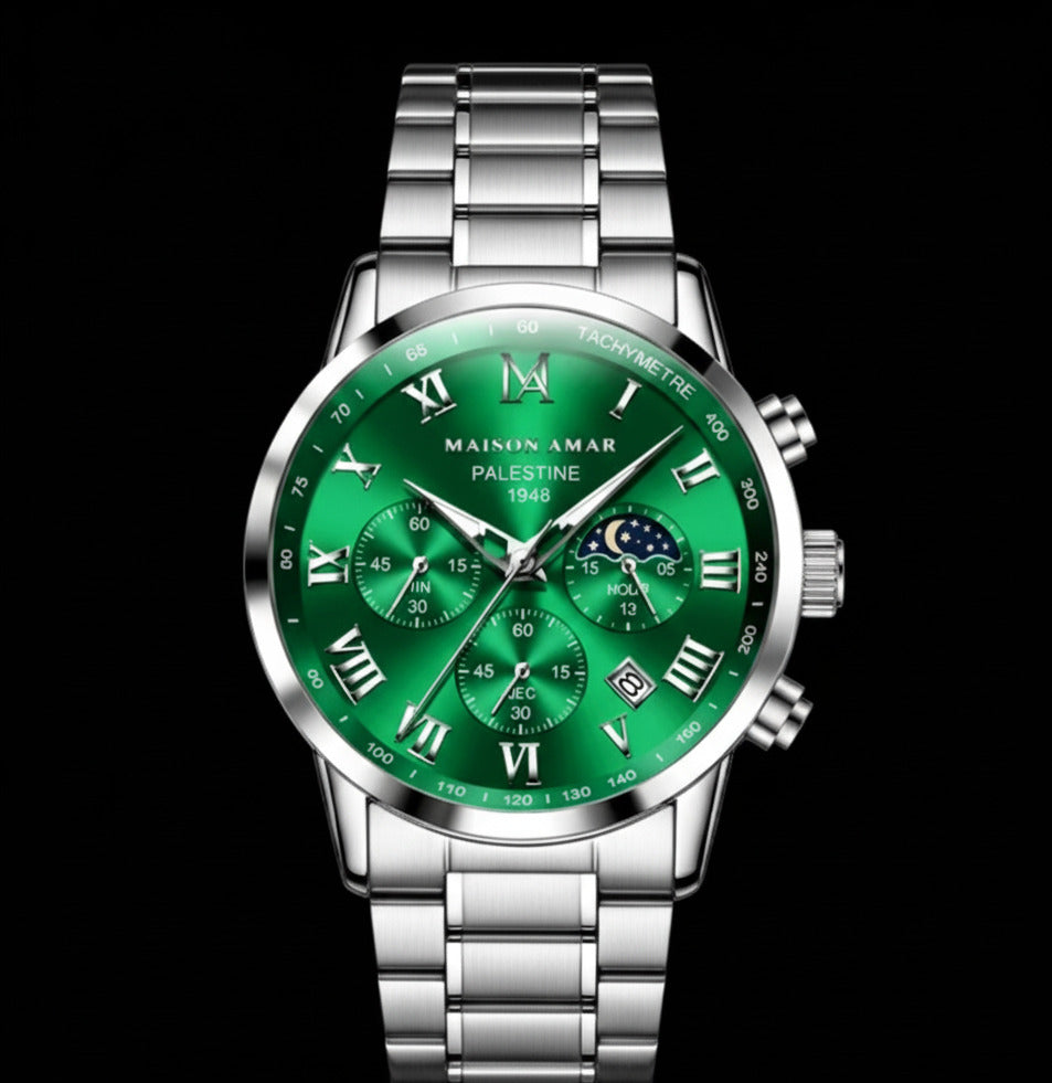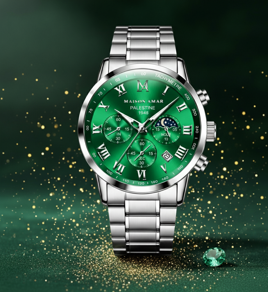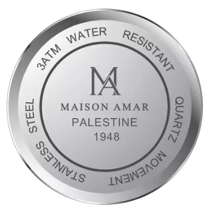 The Maison Amar "Palestine 1948" is more than a timepiece; it is a tribute to history and a celebration of enduring legacy. Crafted with precision and an eye for timeless design, this watch captures the spirit of heritage in every detail. Its elegant green face is a tribute to the land it honors and is the heart of a sophisticated and meaningful accessory.